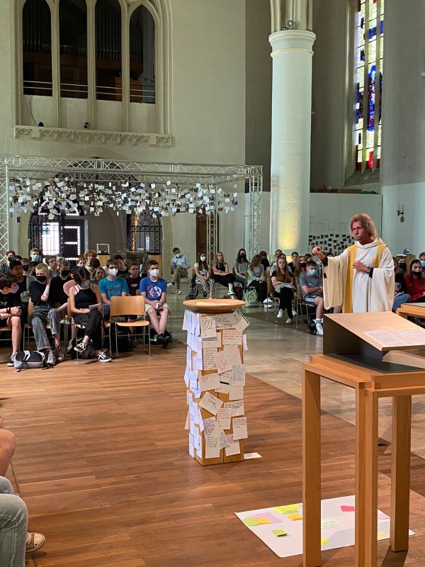 Denn ein Projekttag zum Thema Eucharistie ist auch für die Jugendkirche Münster eine Premiere. In drei Gruppen aufgeteilt, beschäftigten sich die 88 Schüler am Vormittag mit der Einleitung und dem Schluss, dem Wortgottesdienst und der Eucharistie. Sie nehmen die Bedeutung des Kreuzzeichens unter die Lupe, schreiben die Namen aller Schüler auf den Altar, um die Gemeinschaft zu verdeutlichen, und formulierten Fürbitten über das Online-Tool „Mentimeter“, eine App, mit der es möglich ist, mit dem Smartphone in Echtzeit Rückmeldung zu geben. „Die Lebenswelt der Schülerinnen und Schüler soll miteinbezogen werden“, begründete Eva Brambrink, pastorale Mitarbeiterin in der Jugendkirche, die Wahl des Mediums. Die Jugendlichen erfahren, was bei der Wandlung passiert und wieso die Kommunion an alle im Gottesdienst ausgeteilt wird. Sie verfassten zudem eigene Gebete und geben beim Segen einander gute Wünsche mit auf den Weg. Eine schöne Erfahrung, selbst einen Gottesdienst mitzugestalten, sind sich Eva van Berlo und Romy Kaul am Ende einig. „Der Projekttag ist abwechslungsreich, nicht zu lang und man bekommt einen anderen Zugang zum Gottesdienst“, sagt die 14-jährige