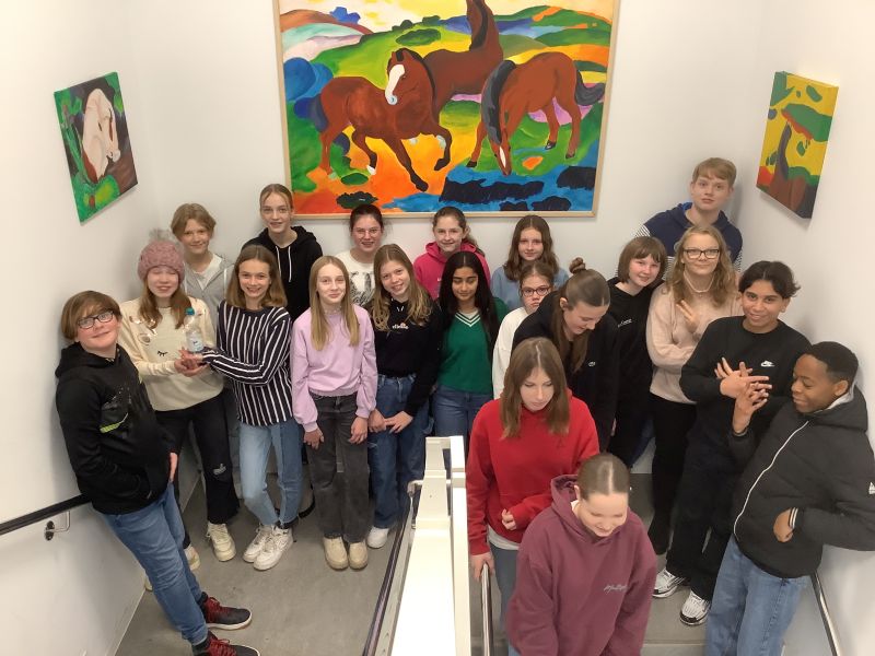 Der Kunstkurs der Klassen 7 hat für das Treppenhaus des Klassencontainers ein neues großes Bild gestaltet. Dabei ließen sich die 22 Schülerinnen und Schüler von dem Künstler Franz Marc inspirieren.
