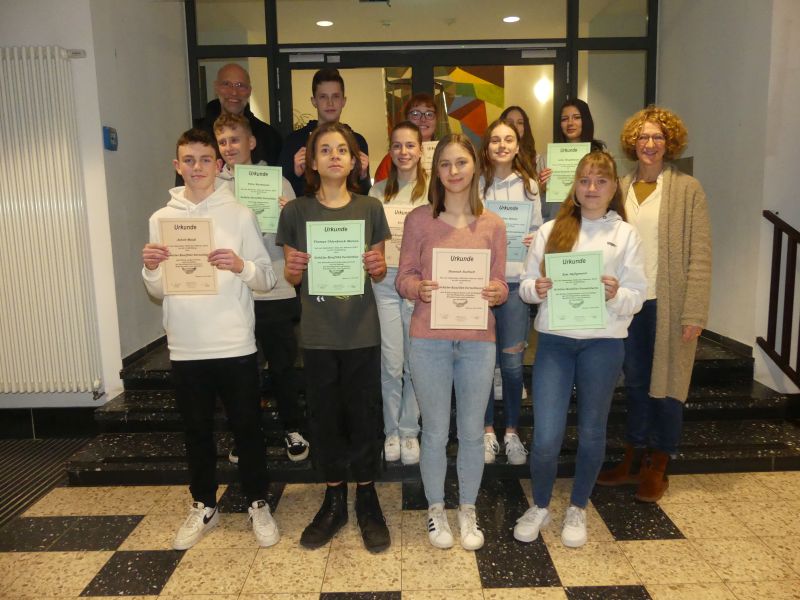 Am Donnerstag bekamen 15 neue Streitschlichter*innen aus den Klassen 8 und 9 in einer kleinen Feierstunde ihre Zertifikate überreicht. Die Beratungslehrer*innen Martina Habbel und Johannes Fögen hatten sie im ersten Schulhalbjahr ausgebildet. Sie werden bald ihre Tätigkeit aufnehmen und nicht nur Streitigkeiten zwischen den Schülern schlichten, sondern vor allem als Pat*innen für die neuen Klassen 5 arbeiten. In einer AG haben sie gelernt, weshalb es zu Streitigkeiten kommt, nach welchen Prinzipien Streitschlichtung abläuft und wie mit aktivem Zuhören, Gesprächstechniken, durchdachten Fragen und Perspektivwechseln eine Schlichtung erfolgreich durchgeführt werden kann. All diese Fähigkeiten werden sie gut nutzen können, wenn sie sich um die jungen Schüler*innen kümmern.