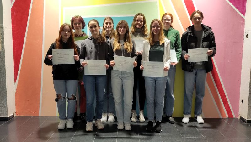 Kursleiterin Sonja Hellmann überreichte gemeinsam mit Organisatorin Heike Hoppe (fbs) nicht nur die Zertifikate, sondern lobte auch ausdrücklich das besondere Engagement und die Zuverlässigkeit der Jugendlichen.