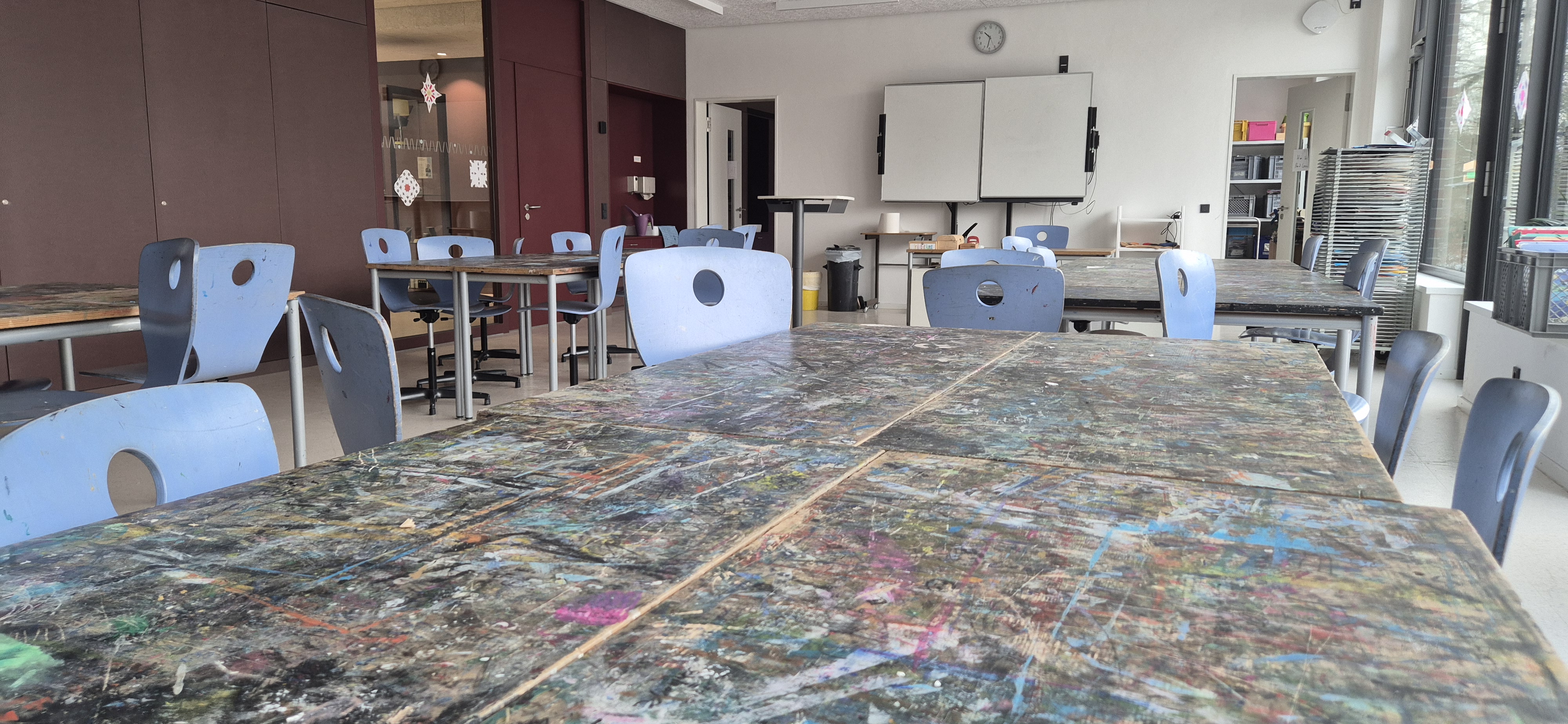Kunstraum: Der Kunstraum bietet viele Möglichkeiten kreativ zu malen oder zu basteln. Ein umfangreiches Repertoir an Arbeitsmaterialien steht zur Verfügung. Direkt nebenan: Werkbank und grünes Klassenzimmer im Freien.