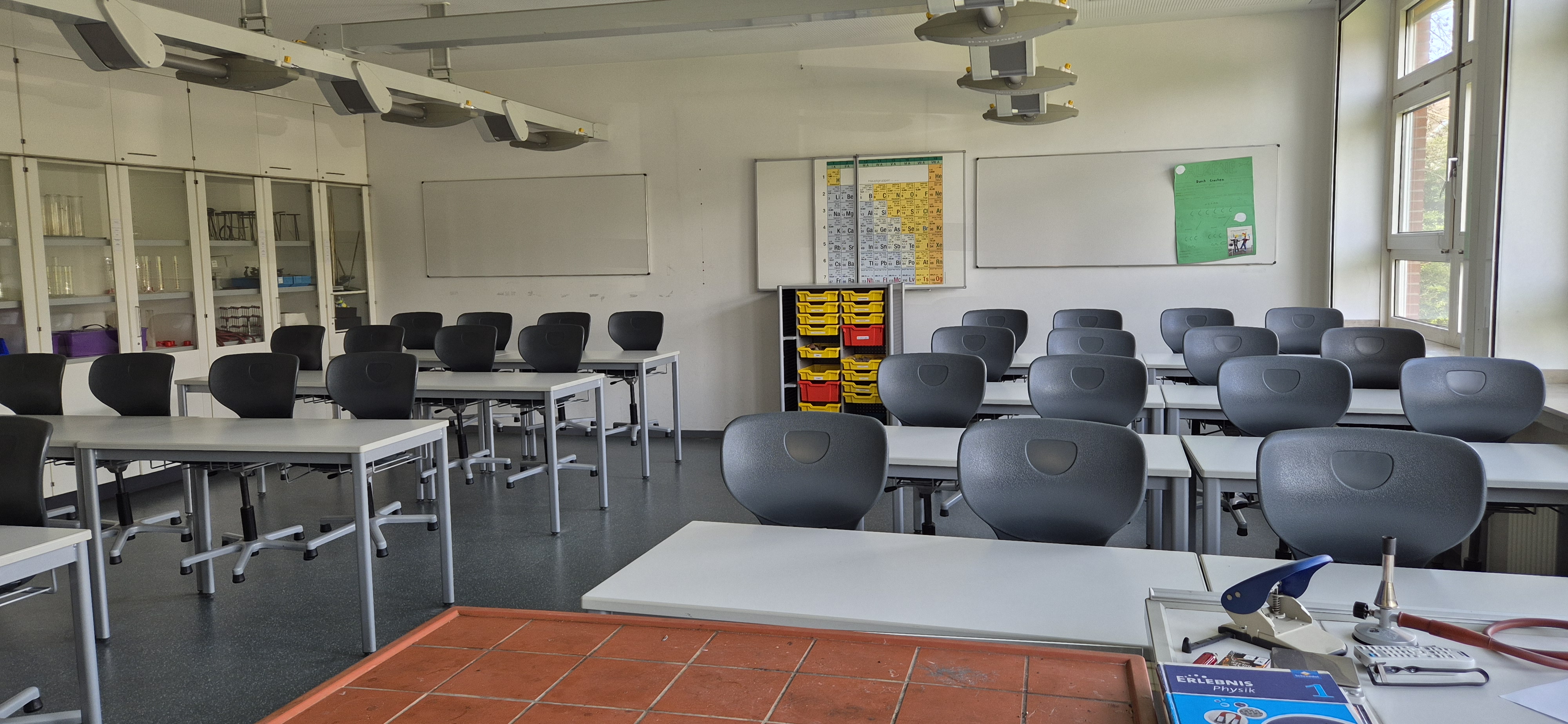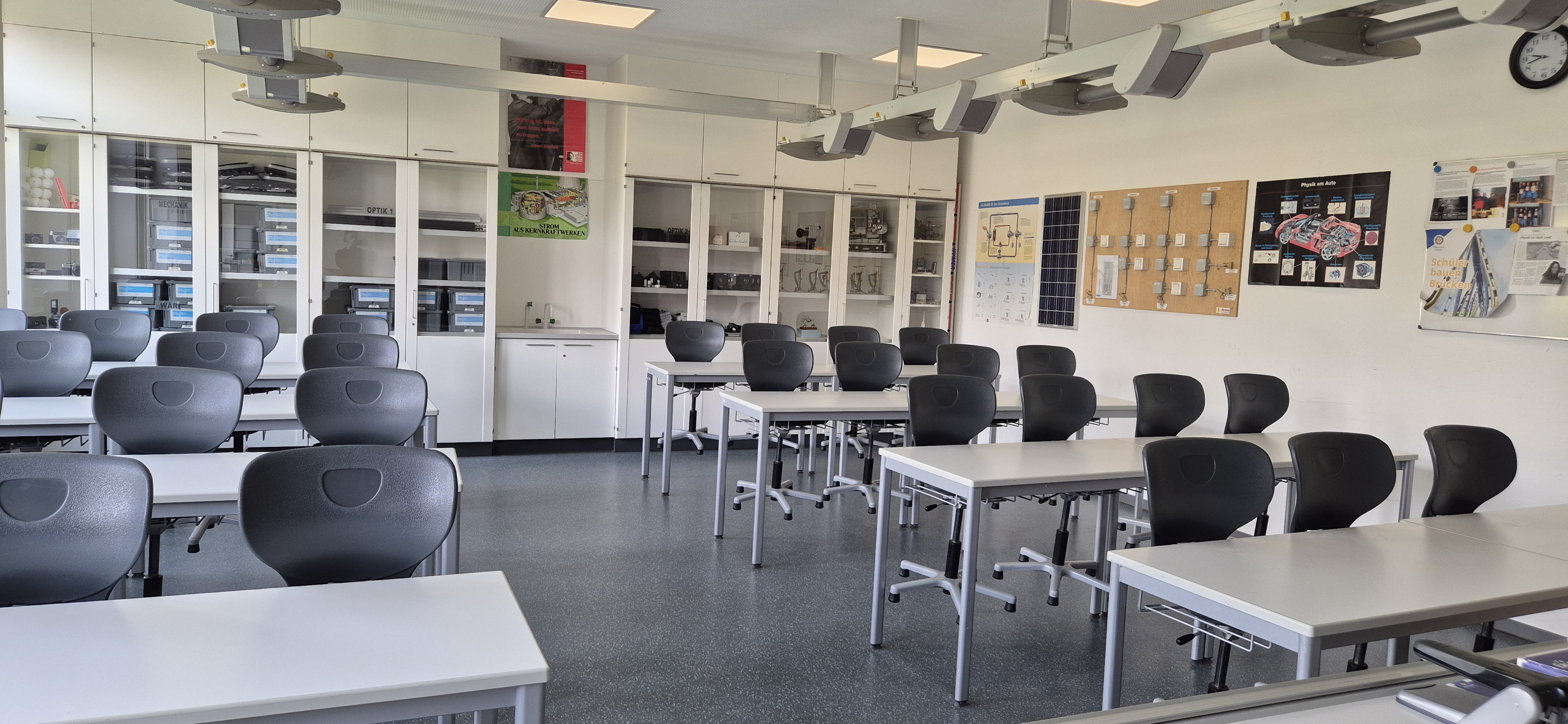 Der Physikraum ist wie Biologie und Chemie ausgestattet: Jeder Schülertisch hat Strom- und Gasanschluss. Ein Vorbereitungsraum mit Versuchsmaterial für Lehrer und Schüler rundet die Ausstattung ab.
