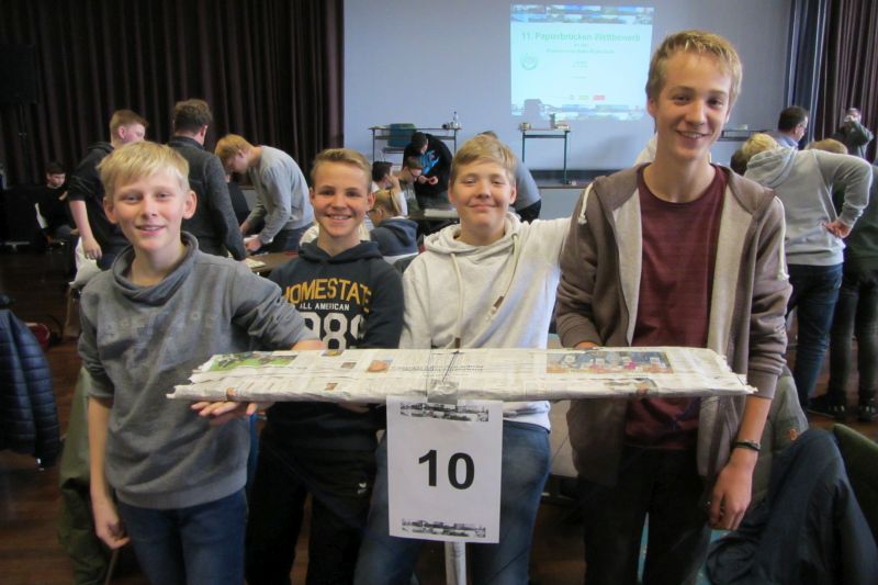 Insgesamt drei Stunden haben 75 Schüler von zehn verschiedenen Schulen, eingeteilt in 20 Gruppen, an ihren Papierbrücken gearbeitet – darunter drei Gruppen der Freiherr-vom-Stein-Realschule und zwei von der Theodor-Heuss-Realschule. „Wir haben in zwei Schulstunden schon Ideen gesammelt“, erklärt Olivija. „Danach folgte ein Probebau. Danach haben wir alles mit unserer Gruppe besprochen und beschlossen, dass wir das so machen wollen“, fügt Michelle hinzu. Die beiden Neuntklässlerinnen von der Gastgeberschule landen mit ihren beiden Gruppenmitgliedern Mattis und Lars am Ende des Tages auf dem 15. Platz.