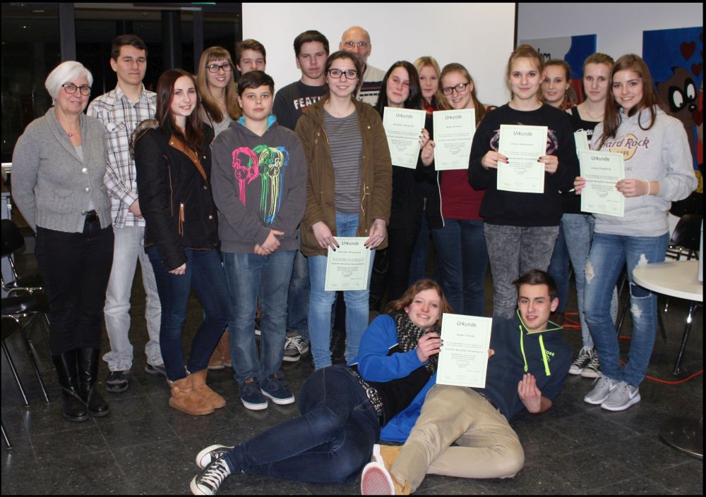 16 neu ausgebildete Streitschlichter der Klassen 9 erhielten am 10. Februar ihre Zertifikate aus den Händen der Beratungslehrer Fr. Hoffknecht und Hr. Fögen. Zu der einstündigen Veranstaltung waren auch die Eltern eingeladen und konnten miterleben, was ihre Kinder während ihrer Ausbildungszeit seit Beginn dieses Schuljahres u. a. in den Bereichen Mediation, Perspektivwechsel und aktivem Zuhören gelernt haben. Nach den Osterferien werden die neuen Streitschlichter ihre Arbeit in der Schule aufnehmen, im kommenden Jahr werden sie auch die Paten für die Klassen 5 sein.