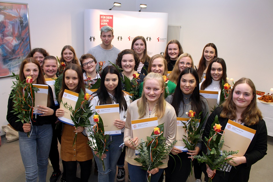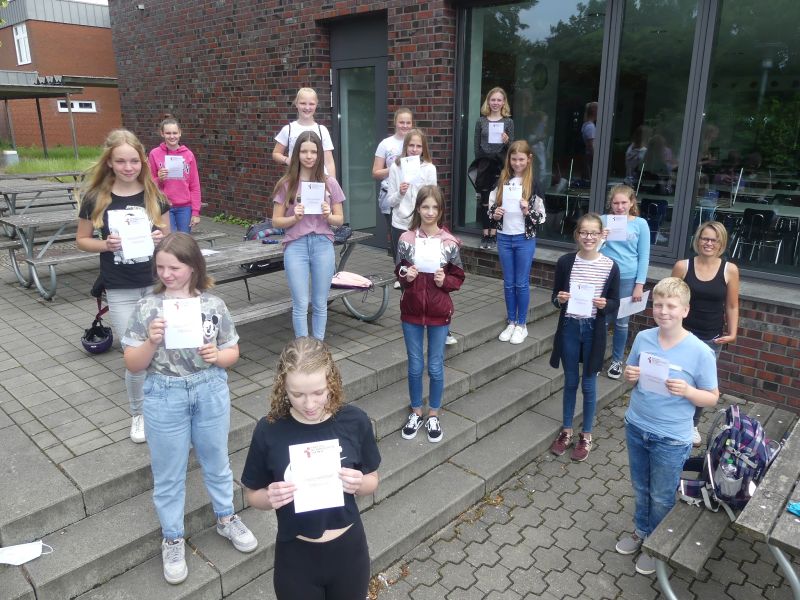 Unter erschwerten Bedingungen haben 14 Schülerinnen und Schüler erfolgreich den Babysitterkurs absolviert und am Montag von Eva-Maria Weimann ihre Diplome erhalten. In sieben Unterrichtseinheiten hatte die Referentin der Familienbildungsstätte sie fit für ihre neue Aufgabe gemacht. Die Jugendlichen haben gelernt, was zur Betreuung eines Kindes gehört: Wickeltechniken, Pflege, Beschäftigungsmöglichkeiten und Spiele, Verhalten in schwierigen "erzieherischen" Situationen usw... Bei der Zertifikatsübergabe berichteten sie von ihren ersten Erfahrungen mit ihren Aufpasskindern.