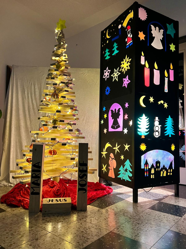 Im Auftrag der evangelischen Kirchengemeinde hat die Klasse 9A eine moderne Krippe gebaut. Sie kann bis Heiligabend im evangelischen Gemeindehaus besichtigt werden, anschließend steht in der Christuskirche.