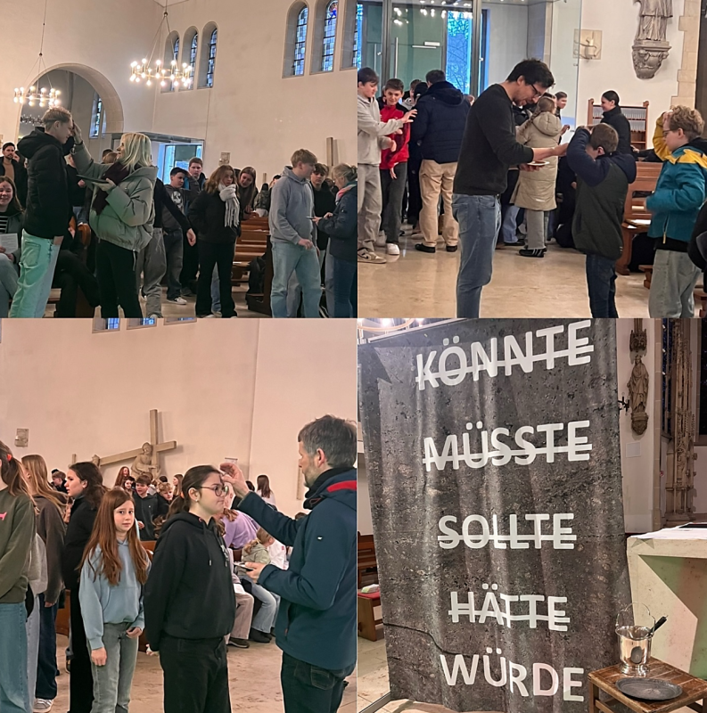 Mitten im Schulalltag haben wir heute bewusst innegehalten und gemeinsam Aschermittwoch gefeiert. Auf dem diesjährigen Hungertuch der Schule Athen stehen Worte, die viele aus ihrem Alltag kennen: Könnte. Müsste. Sollte. Hätte. Würde. Begriffe, die Erwartungen formulieren, antreiben – und manchmal auch unter Druck setzen.