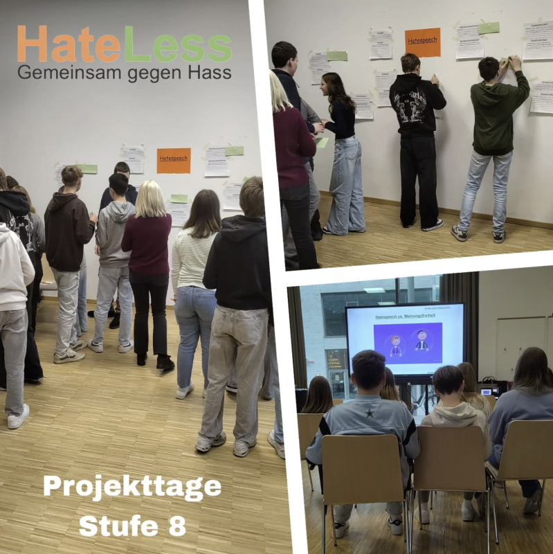 Drei Klassen des 8. Jahrgangs haben in dieser Woche am Präventionsprogramm „HateLess – Gemeinsam gegen Hass“ teilgenommen. In Workshops setzten sich die Schülerinnen und Schüler mit Hassrede, respektvoller Kommunikation und Zivilcourage auseinander und entwickelten eigene Ideen für eine „HateLess‑Klasse“.