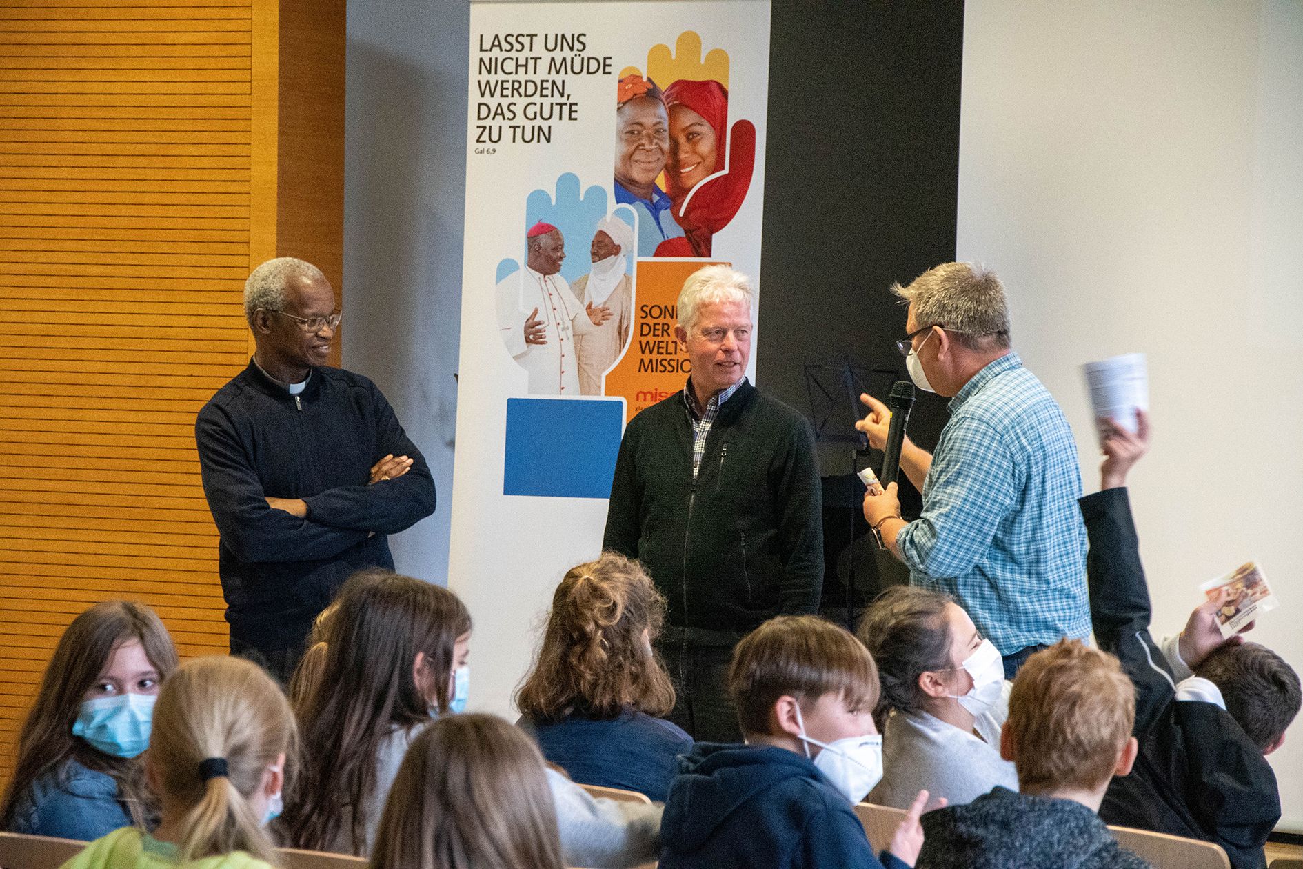 So lernten die Fünftklässler im Gespräch mit Bischof Richard viel über seine Heimat, sein Bistum und das Leben in Ghana kennen. Der 62-Jährige, der gut deutsch spricht, zeigte ihnen Fotos beispielsweise von einem Kindergarten und einer Schule. Die Bänke und Tische stehen nur in dem Klassenzimmer, weil es Menschen wie euch gibt, die uns unterstützen, erklärte der Ordensgeistliche. Die 90 Kinder nutzen die Zeit, um Bischof Richard mit ihren Fragen zu löchern. Was isst man in Ghana? Gibt es Schulbusse? Welche Haustiere gibt es? Sind alle Städte arm? Gibt es eine Übermittagsbetreuung in den Schulen? Bekommt man einen Job, wenn man studiert hat? Sind unsere Spenden nicht sinnlos, wenn nur so wenig davon angeschafft werden kann? Auf gar keinen Fall, antwortete der Gast aus Ghana. Eure Spenden sind sehr wichtig, und sie werden gebraucht. Denn in vielen Dörfern gibt es keine Unterstützung von der Regierung. Vom dem Geld, das ihr sammelt, werden zum Beispiel auch Schulhefte gekauft, damit die Kinder richtig lernen können, machte er deutlich.