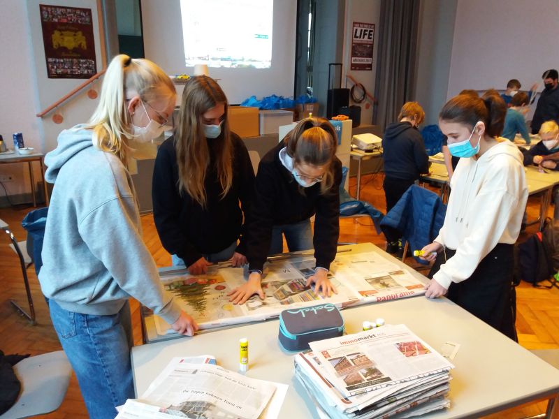 Sinnsucher kreativ: Gemeinsam mit einer Künstlerin haben die SchülerInnen ein Bild zum Thema „Zeit“ entwickelt und dabei unterschiedliche Impulse erhalten.
