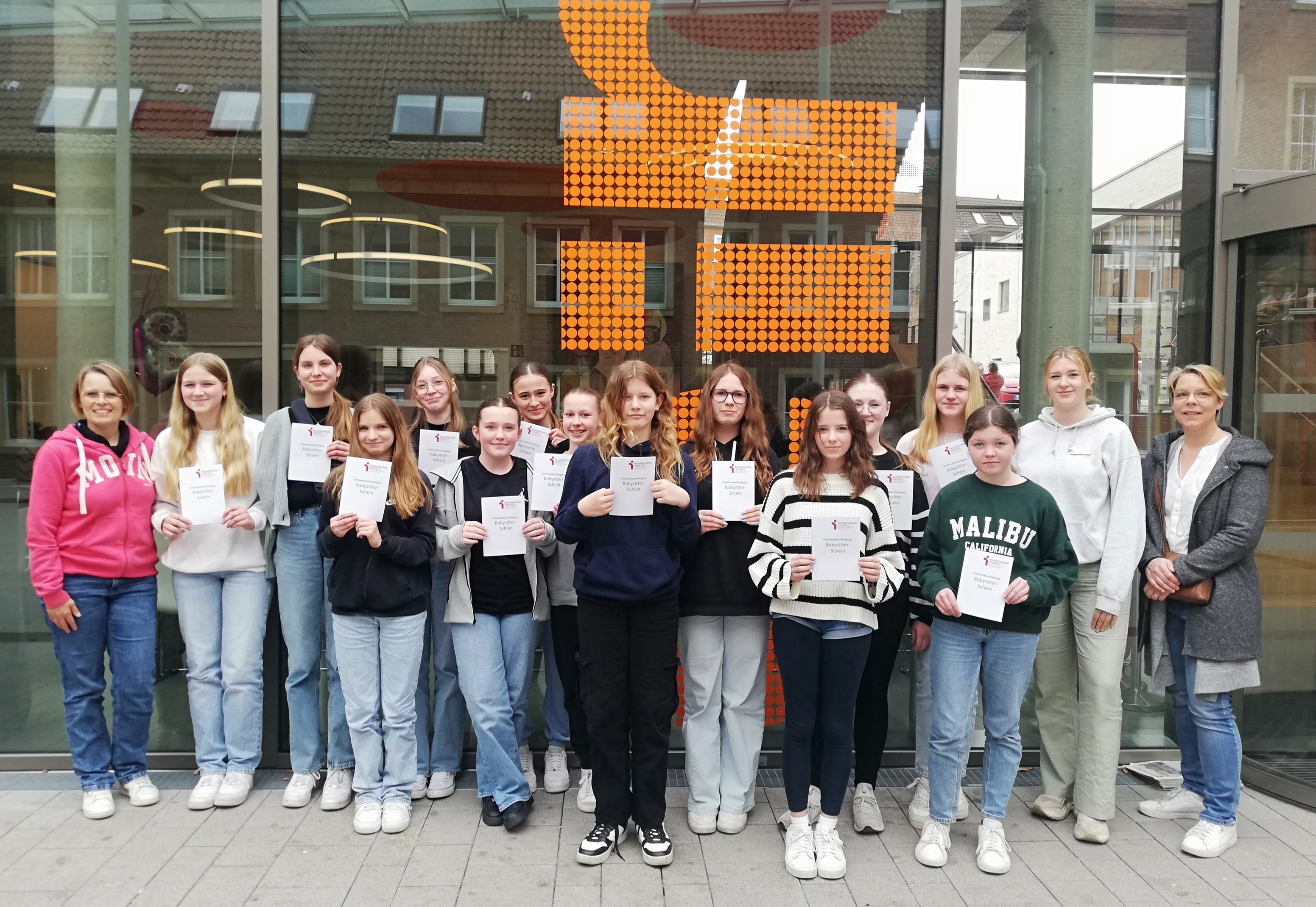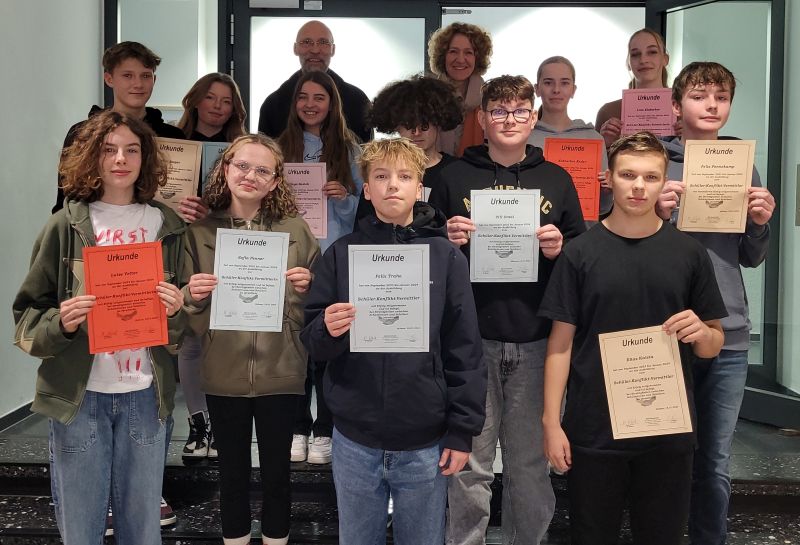 In einer kleinen Feierstunde bekamen zwölf neue Streitschlichter*innen aus den Klassen 8 und 9 in ihre Zertifikate überreicht. Nach ihrer Ausbildung im ersten Halbjahr durch die Beratungslehrer*innen Martina Habbel und Johannes Fögen werden sie jetzt ihre Tätigkeit aufnehmen und nicht nur Streitigkeiten zwischen den Schüler*innen schlichten, sondern vor allem als Pat*innen für die neuen Klassen 5 arbeiten. Dafür sind sie bestens vorbereitet. Sie haben gelernt, weshalb es zu Streitigkeiten kommt, wie man damit umgehen und Lösungen finden kann. Sie können aktiv zuhören, Gespräche leiten und die Perspektive wechseln. All diese Fähigkeiten werden sie gut nutzen können, wenn sie sich als Pat*innen um die jungen Schüler*innen kümmern.