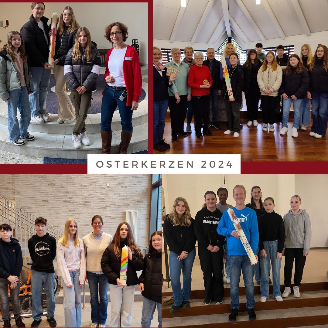 Wir freuen uns, dass diese Tradition entstanden ist und wir als Marienschule für unterschiedliche Institutionen Osterkerzen gestalten. Die Siebtklässler des Kunstkurses von Herrn Heinemann haben sich viele Gedanken gemacht und es sind tolle Kerzen. Fünf an der Zahl sind es geworden: Eine wird im Foyer des einsA stehen, eine im Altenheim der Heilig-Geist-Stiftung, eine in der evangelischen Kirche, eine in der Krankenhauskapelle sowie eine in der Schule. Was sie eint, sind das Kreuz, die Helligkeit sowie die Vielfalt und die Hoffnung, die auf den verschiedenen Kerzen zum Tragen kommen.