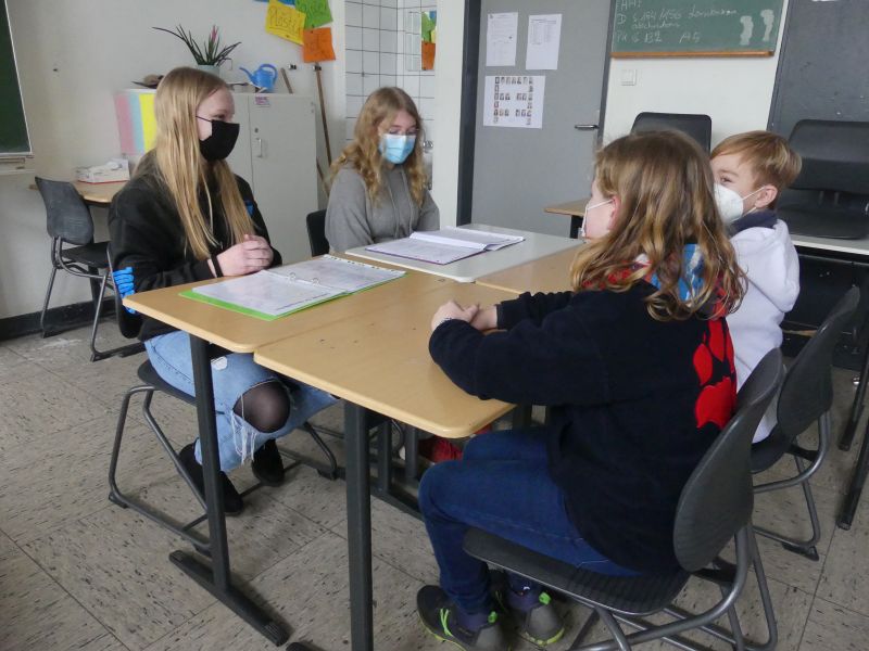 Wie eine Streitschlichtung abläuft, erprobten die neuen Schlichter mit einigen freiwilligen Kindern aus der Erprobungsstufe. Dafür mussten die Kinder sich einen Streit überlegen und ihre Rolle vertreten, die neuen Streitschlichter halfen beim aktiven Zuhören, beim Perspektivwechsel und dem Finden einer Lösung. Anschließend wurde diese Erfahrung noch einmal in der großen Runde reflektiert.